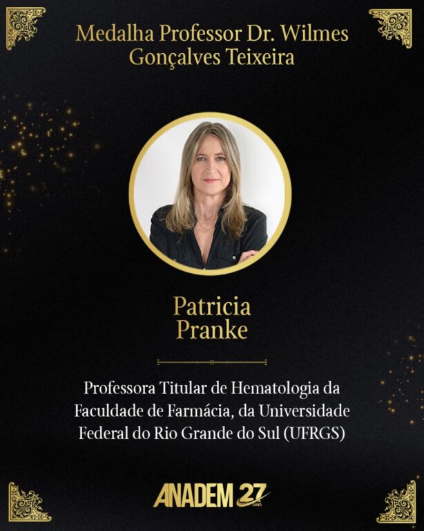 Em decisão unânime dos conselhos da Sociedade Brasileira de Direito Médico e Bioética (ANADEM), a professora Drª Patricia Pranke foi agraciada com a Medalha e Diploma Professor Wilmes Gonçalves Teixeira. A condecoração, a mais alta da entidade, reconhece trajetórias excepcionais na área da saúde.