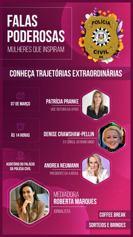 No dia 07/03/2024, a Profª Drª Patricia Pranke, irá participar do evento "Falas poderosas - Mulheres que Inspiram". O evento promovido pela polícia civil do estado, no mês dedicado às mulheres - onde celebra-se o Dia Internacional da Mulher -, acontecerá no auditório do palácio da polícia civil às 14h.